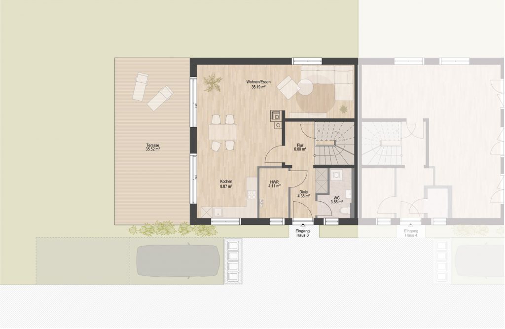 Haus 3 bietet Ihnen ein Zuhause mit Raum zum Leben. Mit einer Wohnfläche von ca. 148 m², einer großzügigen Terrasse und einem eigenen Grundstück von ca. 626 m² genießen Sie großzügiges Wohnen mit viel Platz für Familie, Alltag und persönliche Entfaltung.